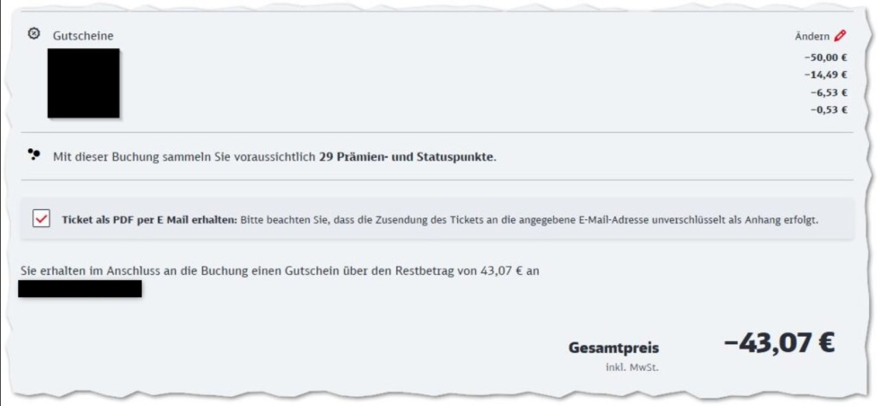 Von dem neuen Restwertgutschein konnte dann eine weitere Fahrkarte gebucht werden für 20,98 €, sodass ein Restwertgutschein von 6,53 € übrig bleibt. 0,53 €, 14,49 € und 6,53 € statt zusammen 21,55 €.