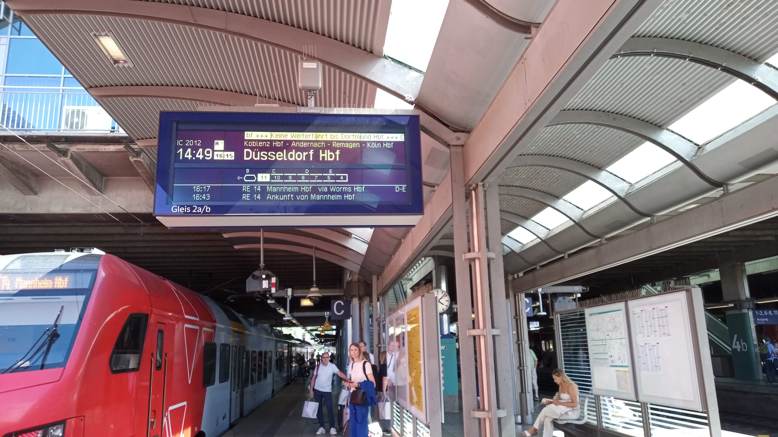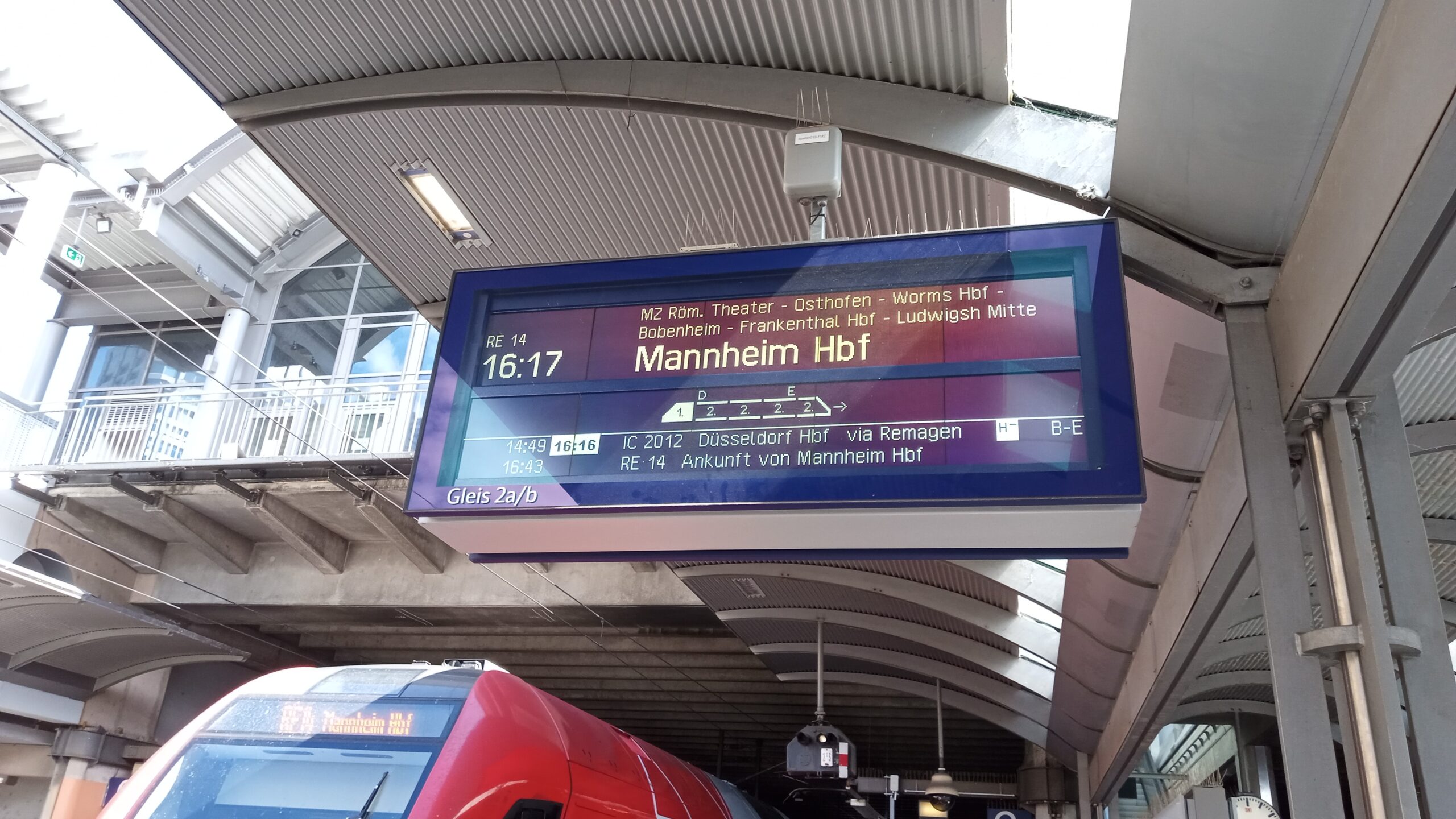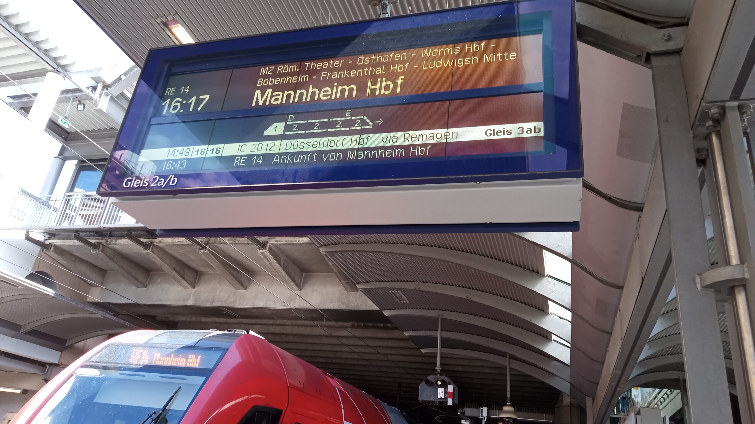 Um 16:08 steht der RE, der um 16:17 soll bereits auf Gleis 2 des Mainzer Hauptbahnhofs. Für 16:15 ist die Abfahrt eines verspäteten IC nach Dortmund angekündigt (der vorzeitig in Düsseldorf endet).